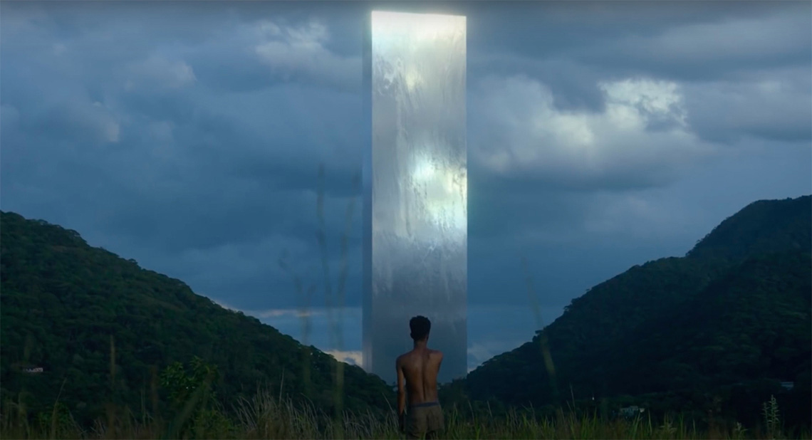 O protagonista chega no que parece ser o encontro de praticantes de religião de matriz africana e celebra com eles alegremente quando começam as batidas rítmicas características. Seu semblante alegre serve de passagem para mais uma mudança, estamos diante do rosto sorridente do protagonista em meio à outra paisagem bucólica, ancestral, as batidas e a cantoria prosseguem e a euforia parece tomar o protagonista que corre e salta até que o som mais uma vez dá lugar a uma transição. Ouvimos o som ambiente de um espaço cheio de mato a céu aberto, a câmera vira e vemos nosso protagonista de costas encarando no fundo da paisagem um imenso monólito prateado e brilhante, uma possível referência ao monólito presente no filme 2001: uma odisseia no espaço dirigido por Stanley Kubrick. No longa metragem de 196812, Kubrick utiliza o Monólito – que na sua versão é inteiramente preto e fosco – para marcar mudanças significativas na evolução da humanidade, dos habitantes das cavernas – a infância numa perspectiva evolutiva – para a era espacial, e finalmente em direção ao que poderia ser uma evolução metafísica da consciência humana. Esse marco no vídeo que acompanhamos até aqui, parece ser uma transição para o último ato.