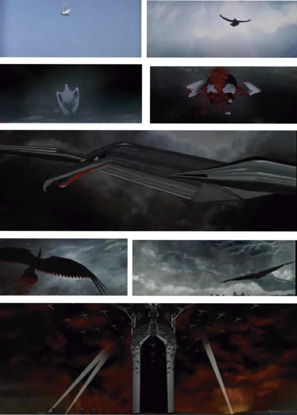 O horror da guerra é cantado e visualizado. Pomba, ave, avião e em seguida, as cruzes cobrem o céu (Figura 3). A morte se faz presente e o símbolo da pátria se desmancha. É a bandeira que se torna a imagem da cruz, encharcada de sangue inocente. Do céu, surge novamente a ave raivosa que se transforma, em meio as chamas, em destroços e ferros retorcidos.