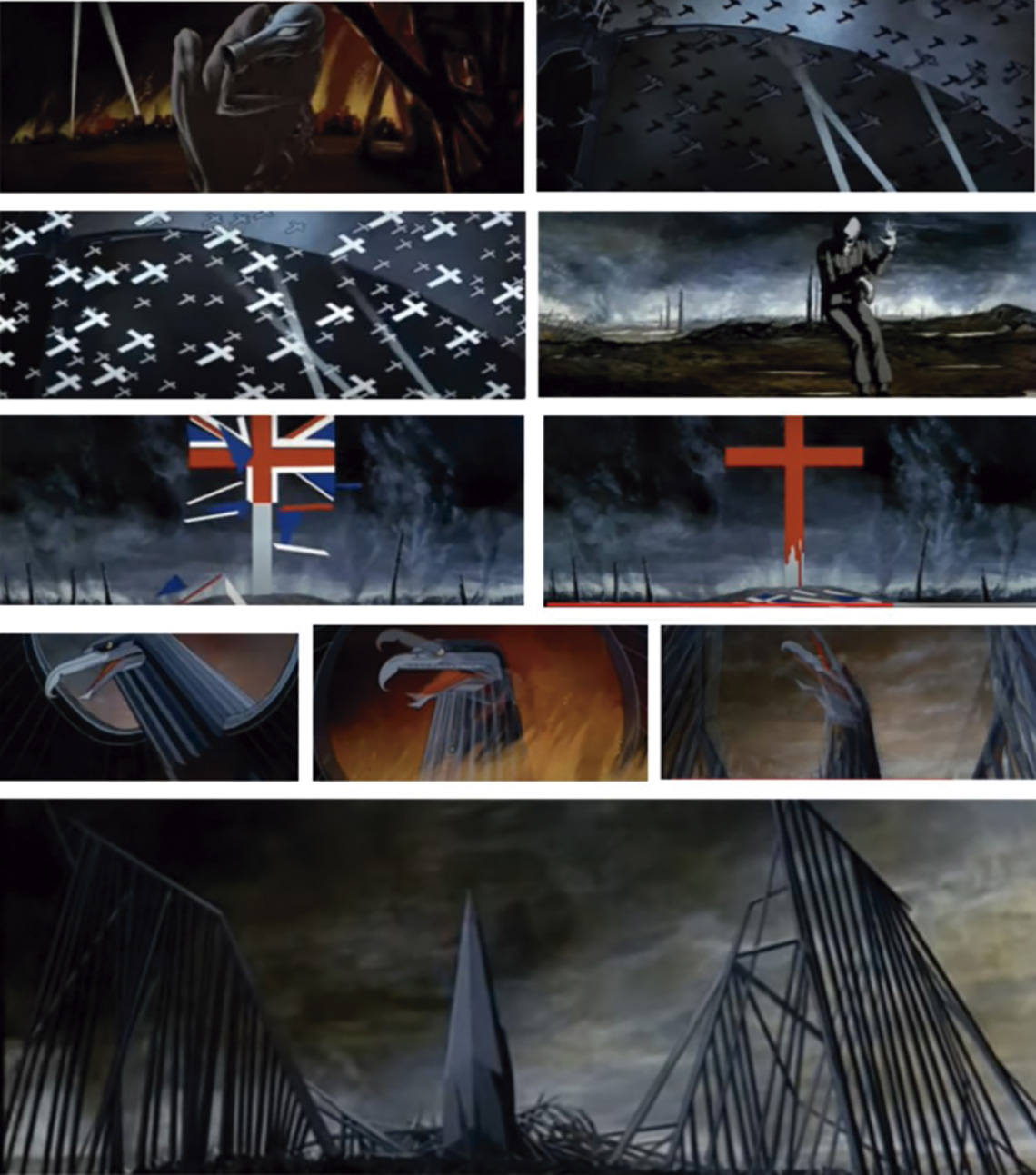A possibilidade de aproximação entre o receptor e a dor experienciada pelo protagonista, cresce também, pela força comunicativa das imagens animadas de Gerald Antony Scafe. O cartunista inglês contribui para que a mensagem da música “Goodbye Blue Sky”, por exemplo, transmitisse todo o horror e o sofrimento provocado pela devastação que a guerra provoca. Suas figuras se metamorfoseiam compondo uma narrativa coadunada com a canção. Nas imagens que seguem é possível verificar uma pomba voando no fundo azul do céu. A ave ocupa o imaginário social como símbolo da paz (Figura 1), mas na animação se transforma em águia que arranca, com suas garras, as terras de Londres, para depois transformar-se em avião que bombardeia a cidade. Todo apelo da estética sensível, aciona a visão e a audição para a realidade da morte.