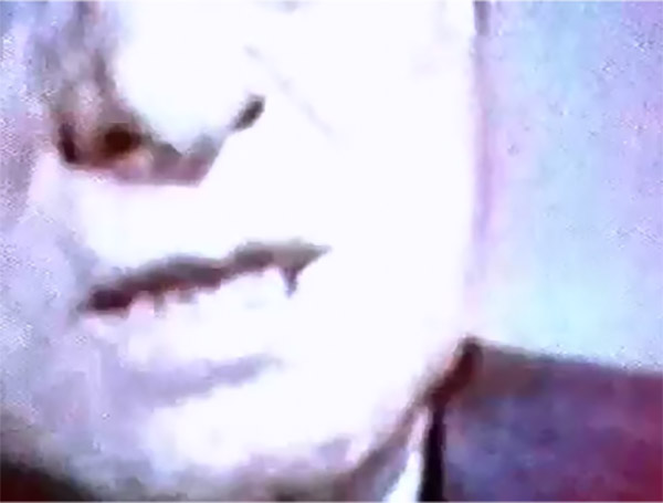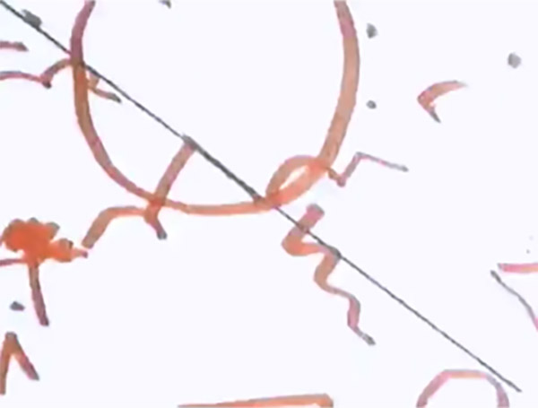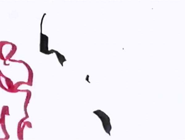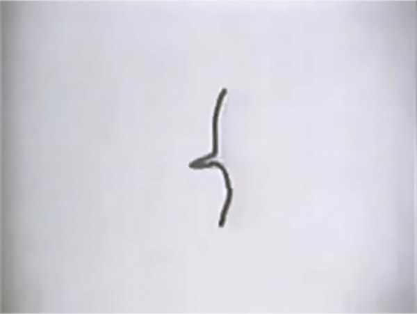 From the beginning of “BANG”, it is almost understandable that Breer is trying to talk to his audience as well as the players of the Epic theatre. The reason for this concept is that at the beginning of the animation a question is displayed on the screen: “Are you deft?” (Frames 3). Other words and questions are shown on the screen during this animation, too. A cinematic strategy like this on behalf of Breer seems to be equivalent to the Epic theatre players’ strategy for calling spectators and talking to them. Moreover, in another plan of this animation, the sound is interrupted abruptly for a short period when a human’s voice is heard while asking: “Hey, how come I’m not hearing this?!” This strategy can be considered again as an equivalent to the Epic theatre player’s actions for speaking with audiences and asking for their ideas. But, in a very short plan of this animation a close shot of a man’s lower half of face while speaking to the audience is shown and for a short moment, a human’s voice is heard (Frame 4). It is viable to presume that this plan is completely a visual equivalent to the theatrical action of the Epic player who commences talking to audiences for keeping them active throughout the play. It is explicit that when a theatre player speaks to audiences, the continuity of his or her role is crumbled for audiences visually and narratively. Because those audiences, who have gotten used to specific continuity and submergence of the Aristotelian or mainstream theatre, become active via this awakening and alienating action. Therefore, it is possible to assume the Epic theatre player’s talking action is equivalent to the over-mentioned existing non-continuity in Breer’s experimental animation.