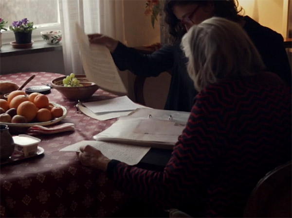 Nesta mesma sequência, o silêncio, por sua vez, é interrompido pela leitura da carta na voz em off da realizadora, abrindo um jogo de temporalidades, que culminará na entrevista com Mariane cercada por livros em sua biblioteca - tempo aproximado 24:25 (figura 4). Cena na qual, é rememorado o dia em que as cartas foram presenteadas à Carol Benjamin com o intuito de “conhecer melhor”, por meio da escrita, em tom confessional, a mulher que a avó foi. Esta sugestão narrativa, pela qual todo o filme é estruturado, coloca em jogo a construção de uma identidade frente a insuficiência da escrita e aos limites da linguagem, expondo as tensões e os espelhamentos entre imagem e palavra, escrita e cinema (ROWLAND, 2016), ao mesmo tempo em que sugere a ruptura do silêncio no trânsito da carta, como se o distanciamento fosse a permissão para falar, contar, narrar.