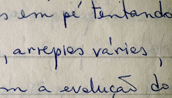 Na sequência em que a câmera percorre capas de livros - ancorada na voz em off de Iramaya narrando como burlava a censura dos militares – a imagem incompleta, por vezes desfocada dos títulos e autores é interrompida por um breve silêncio trazendo a materialidade da carta à cena - tempo aproximado 22:18 (figura 3). Quando a caligrafia caprichada, sublinhada, rasurada, toma todo o enquadramento, revelando texturas e espessuras de um outro tempo, alcançamos não somente a permanente violência e angústia que cingia o momento, mas também algo outro que não participa da visualidade, mas lá está, eclipsado, oculto, em retraimento (retrait), ou seja: aquilo que não pode ser visto mas ainda assim é sugerido pelo traço (DERRIDA, 2010).