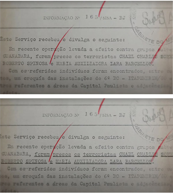 Dessa forma, no filme Retratos de identificação (2014) a recusa pelo nome próprio das vítimas pelos agentes da repressão já aparece acompanhando as primeiras fotografias postas em cena - tempo aproximado 01:20 - em fragmentos textuais nos quais é possível ler ‘o alvo’ (figura 6) referindo-se à Maria Auxiliadora. As intenções de captura através do tratamento conferido acompanham o cotidiano da cena registrada, revelando as técnicas de controle e de investigação ostensiva dos militares. Na sequência, o trecho utilizado da entrevista para o documentário chileno Não é hora de chorar (1971), traz os nomes completos, oralmente, como uma dupla resposta, ao filme e à história. Vale notar, ainda que graficamente representados no documento que registra as prisões – tempo aproximado 02:59 (figura 7) - a montagem opta por interferir e fraturar o arquivo, justapondo temporalidades e conferindo uma nova legibilidade ao que é dado ao sublinhar os nomes.