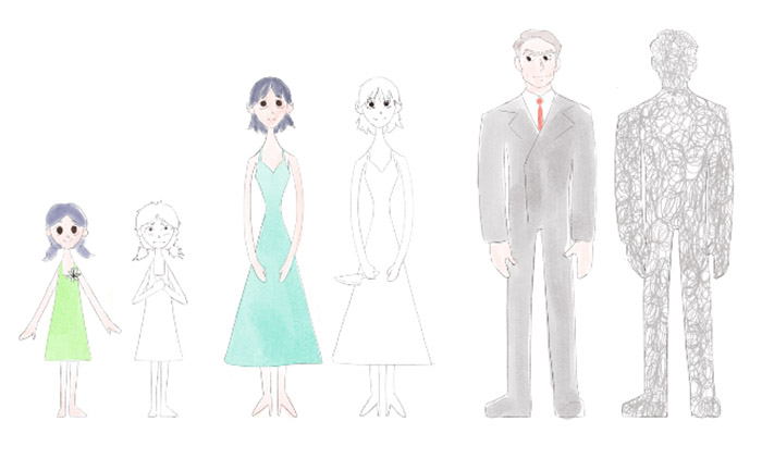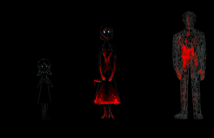 Figura 9 – Sequência do Design das personagens de Infância Carmesim - fonte: autoras do projeto