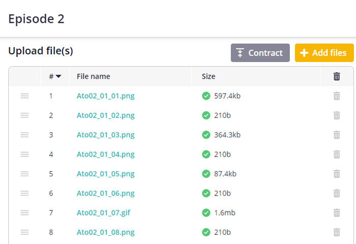 A última etapa para a publicação do projeto Infância Carmesim foi a do carregamento das imagens e animações na plataforma Tapas.io. Após certificar-se que todos os arquivos possuíam as dimensões indicadas pela plataforma, e tamanho menor do que 10 megabytes, os arquivos foram carregados. Devido a lógica de nomeação de arquivos, pode-se organizá-los da maneira previamente estipulada com facilidade.