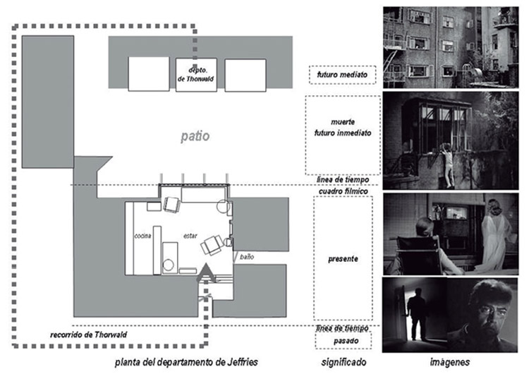 La clave radica en considerar ahora el plano del ventanal no como un límite del espacio entre el interior y el exterior –el interior doméstico de Jeffries y el mundo exterior–, ni como una pantalla de cine, sino como un límite del tiempo. Una membrana que califica al espacio en términos cronológicos: un tiempo presente y un tiempo futuro. El tiempo presente es representado por el monoambiente de Jeffries y por todo lo que en éste ocurre, la convalecencia del personaje, las atenciones de su enfermera y las visitas de su novia. El tiempo futuro está representado por el panorama que se manifiesta más allá del Patio, detrás de las ventanas de los edificios del vecindario que Jeffries alcanza a ver, pero que no puede alcanzar.