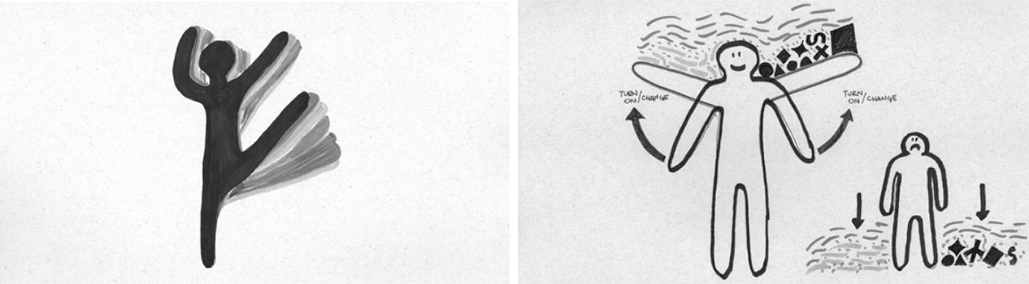 Os primeiros esboços de ideias para o trabalho (Figura 9) mostram o investimento de seus autores em criar alternativas de preenchimento das áreas fora e dentro da sombra do usuário. Está expressa, também, uma proposta de experiência em que os usuários são imaginados de frente para a superfície de projeção, divertindo-se com as alterações de sua própria imagem, uma definição reforçada posteriormente pelos testes de usabilidade e protótipos de experiência (Figura 10).