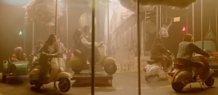 É, no entanto, necessário sublinhar como é traduzida a ideia de liberdade manifestada pelas personagens. Estas movem-se de forma imprevista no interior carrossel. Por sua vez, a ideia de autonomia é realçada pelos veículos (bicicleta e patins). Ou seja, por objetos aos quais se associa a ideia de juventude. Na situação seguinte, as bicicletas dão lugar às vespas, como símbolo da adolescência.