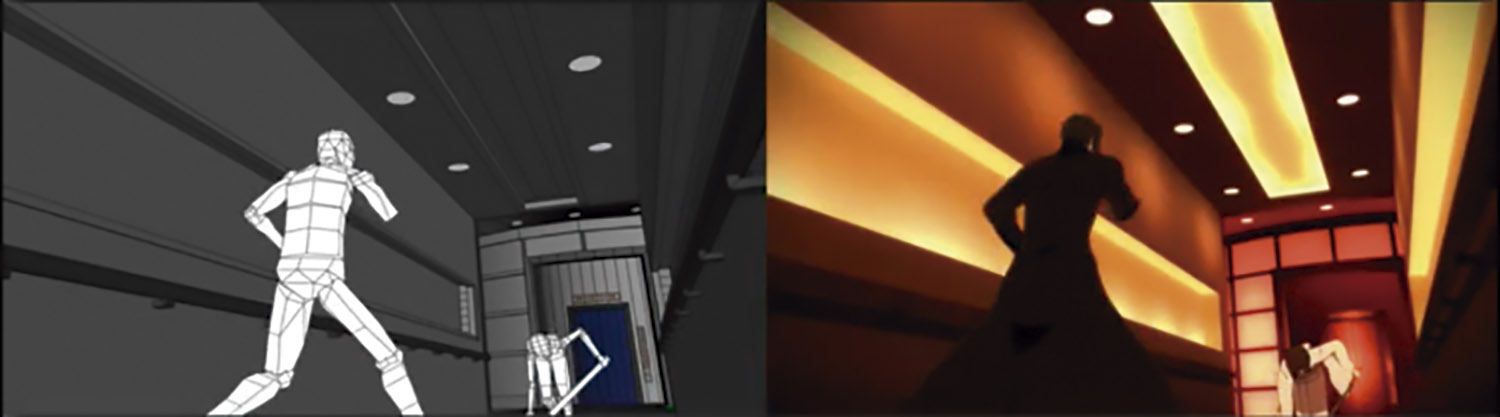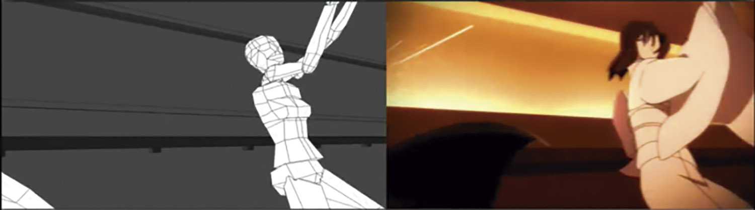Esse suporte se dá ao criar e animar um modelo 3D sem detalhes que contém apenas as proporções e formas básicas do personagem. Em seguida, ao utilizar esta animação como base, é produzida a animação 2D, em um processo semelhante ao de rotoscopia (técnica de animação que consiste no uso de gravações como base para a animação 2D). Essa prática é observada principalmente na criação de cenas de ação dinâmicas, como observado no vídeo “ufotable digitalteam demoreel” (UFOTABLE, 2013) e reduz o tempo de produção de uma cena ao resolver problemas como a manutenção de volume, proporções e perspectiva do personagem.