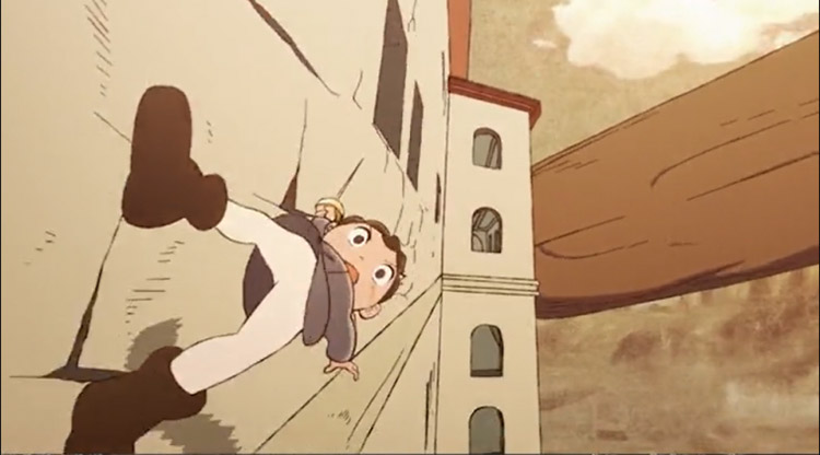 Na cena do exemplo abaixo, a personagem corre pelo cenário. Uma cena de corrida é complicada pois envolve a movimentação do corpo inteiro, além de elementos secundários como roupa e cabelo. Ao envolver perspectiva a dificuldade aumenta, pois ainda é necessário controlar o volume da personagem. No entanto, ao utilizar o 3D, foi possível primeiramente criar um ciclo de corrida e depois deslocar a personagem pela trajetória definida no planejamento.