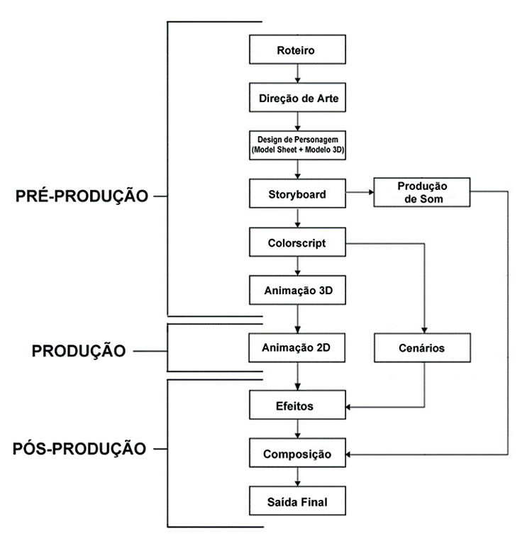 Para auxiliar na organização e identificar o que precisava ser feito, foi utilizado como base o modelo de produção de animação digital 2D apresentado no livro Producing Animation (WINDER; DOWLATABADI, 2011) para a criação de um processo de produção separado em pré-produção, produção e pós-produção, conforme as autoras sugerem. No entanto, foi necessário adaptar o processo, pois este projeto possui as etapas de criação de um modelo 3D e animação 3D durante a pré-produção e não possui vozes na animação.