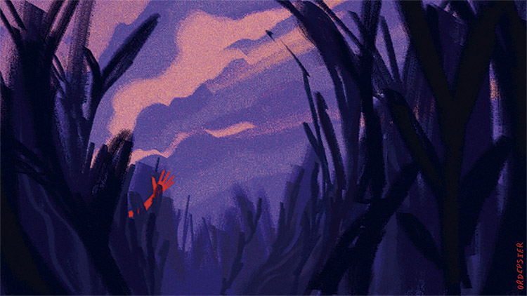 Parte 2: Nesta parte são utilizados tons de azul, cinza, vermelho e marrom. O contraste entre o preto e o vermelho transmite uma sensação de perigo, e o cinza é a cor dos sentimentos sombrios (HELLER, 2012). Portanto, a luminosidade e a saturação de todas as cores, exceto o vermelho, foram diminuídas. Dessa forma, o ambiente ao redor da personagem perde o seu caráter acolhedor e o vermelho adquire um aspecto mais agressivo.