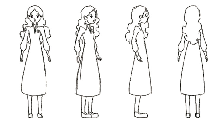 Após a concepção da personagem, foram feitos dois model sheets. Um model sheet é um material de referência criado para determinar a aparência da personagem. O primeiro foi criado para ser usado em planos abertos e médios e o segundo para ser usado em planos próximos. Essa divisão tem como objetivo simplificar o design da personagem nas cenas que utilizam seu corpo inteiro, para que seja mais fácil animá-lo, e preservar os detalhes nas cenas de planos próximos, para conseguir captar as nuances de sua expressão facial.