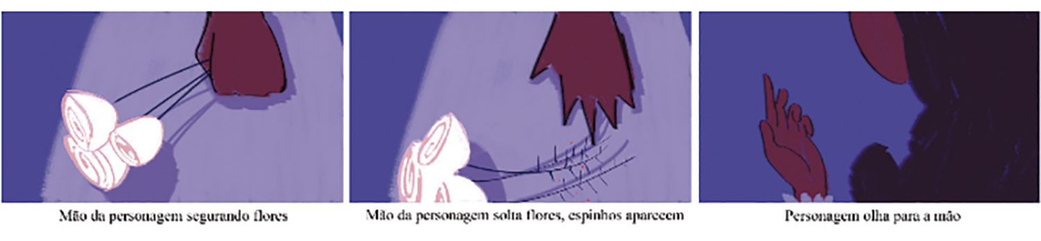 Após a criação da personagem, foi criado um storyboard. Durante esta etapa o objetivo era definir os enquadramentos e o ritmo da animação de acordo com o roteiro previamente relatado. Por exemplo, na cena abaixo, o plano próximo é utilizado para destacar a expressão da personagem ao ouvir uma música em uma flor. Em seguida, a cena é interrompida bruscamente para mostrar que algo de inesperado aconteceu e é utilizado um plano detalhe para evidenciar somente este acontecimento. Então, após o acontecimento, o plano da câmera volta a mostrar o rosto da personagem, denotando assim sua mudança de expressão facial e, por consequência, sua reação ao descobrir um segredo.