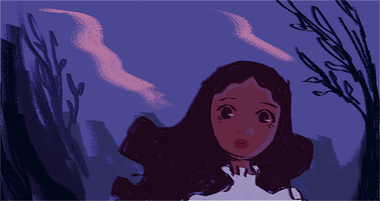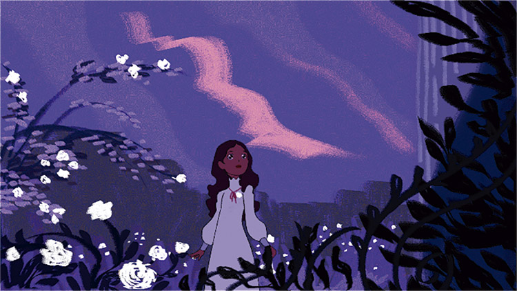 Parte 3: Nesta parte o objetivo é demonstrar o amadurecimento da personagem. Para isso são utilizados tons de verde, cinza e amarelo. O verde é a cor do realístico e possui um efeito psicológico oposto ao roxo (HELLER, 2012), logo, ao ser utilizado demonstra que a personagem já não enxerga mais um mundo de fantasia. O cinza é a cor da neutralidade e da velhice (HELLER, 2012), e é utilizado para mostrar que o mundo já não a encanta mais. O amarelo claro é utilizado nas flores para substituir o branco, para demonstrar que já não há mais inocência neste mundo. O amarelo também é utilizado pois é considerada a mais ambígua das cores (HELLER, 2012), e possui o papel de representar a dúvida da personagem sobre como se sentir em relação a sua nova visão de mundo.
