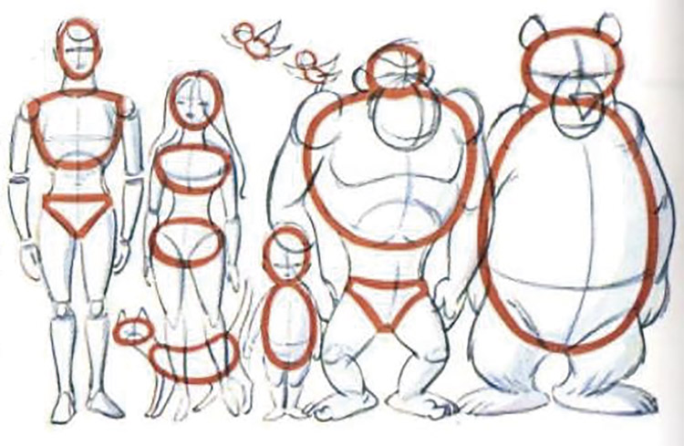 Dentre os princípios da animação, o “Desenho Sólido” consiste na compreensão dos fundamentos do desenho (anatomia e perspectiva) para que seja possível desenhar o personagem de todos os ângulos possíveis (THOMAS; JOHNSTON, 1981). Este princípio é utilizado para controlar as dimensões das formas do personagem e conferir a impressão de tridimensionalidade. No livro “Cartoon Animation”, Blair (1994) mostra que para manter os formatos e proporções de um personagem, o seu corpo é dividido em formas simples. “Ao construir um personagem animado, o visualize como uma marionete tridimensional que você está unindo com massas sólidas” (BLAIR, 1994, p. 40).