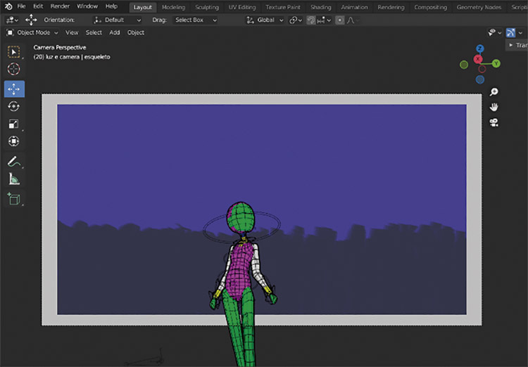 Em seguida, foi criado um modelo 3D no programa Blender com as formas básicas da personagem, com o objetivo de auxiliar na animação. Cada parte do modelo do corpo da personagem recebeu uma cor diferente para determinar a área onde ficaria o rosto, a gola e as mangas do vestido.