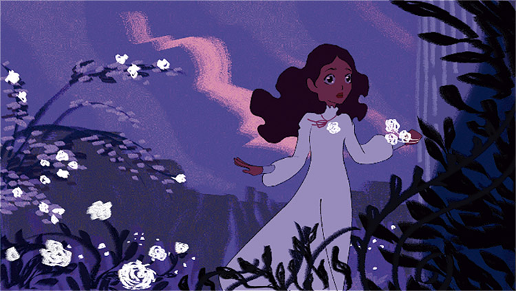 A animação da personagem envolveu 4 elementos, sendo eles: corpo, cabelo, vestido e expressão facial. Os movimentos do corpo foram realizados em 3D na etapa de pré-produção. Graças a isso, foi possível dedicar mais tempo a animação dos outros elementos da personagem, atribuir formas orgânicas ao seu corpo e modificar algumas poses para aperfeiçoar sua dinamicidade, pois problemas como volume e perspectiva já haviam sido resolvidos.