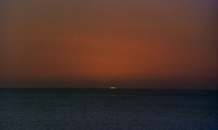 Delphine, tras un verano de tumbos y zozobras amorosas, decide ir a Biarritz a pasar unos días. Allí, durante un paseo de ruta costera, se sienta a escuchar la conversación alejada de unas señoras de la provincia. Hablan sobre Le Rayon Vert, la novela de viajes de Julio Verne, quien acuña este nombre, “el rayo verde”, para referirse al discreto destello de color verde con el que cierra el sol del atardecer. Según Verne, cuando alguien ve esa luz casi esmeralda, los pensamientos propios y ajenos se revelan como por arte de magia. Poco inspirada por estas palabras y de capa caída por los infortunios del viaje, Delphine resuelve ir a la estación de tren para volver a París, su ciudad de residencia. Mientras espera el tren, un chico se le acerca con la excusa de un libro de Dostoievski y le pregunta qué hace ahí. Por invitación del chico, y para frenar la vuelta a la rutina, lo acompaña a visitar Saint-Jean-de-Luz, donde una caminata a orillas del mar y las vistas al Atlántico emplazan la puesta de sol en la que destellará, para sorpresa de ambos, el rayo verde [Figura 1].