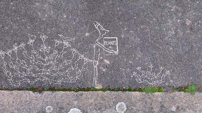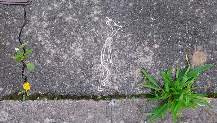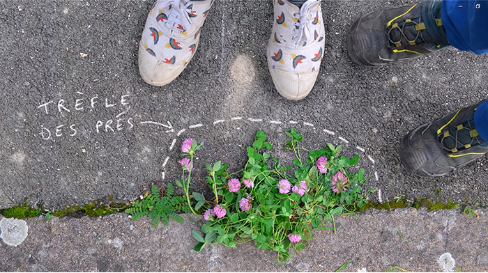 O estudo de caso selecionado para o efeito do presente estudo, trata-se de uma curta-metragem de animação intitulada ‘Nom d’une plante!’ (2022)10. Surgindo intitulada em inglês de ‘In the name of plants’, tem argumento e realização de Hervé Bressaud. De um modo cativante apresenta uma linguagem plástica que combina imagem real com desenho animado. Inicia com uma cena que regista uma reflexão com recurso à palavra ao sugerir que o hábito humano de evitar percorrer atalhos pode levar ao risco de se perderem coisas de interesse no caminho, valendo a pena o desvio de percursos com uma dedicada atenção. Desse modo, situa a profundidade do tema central que dirige a atenção dos protagonistas humanos, para as discretas ambiências compostas com as plantas à beira dos caminhos que percorremos, mas que muitas vezes não observamos e frequentemente, não consideramos. ‘Em Nome das Plantas’, como animação dirigida aos mais novos, versa sobre um explorador humano que ao chegar de para-quedas ao solo, percorre uma zona de chão alcatroado. E inusitadamente aí, descobre vida por entre estreitas brechas no solo. Surpreso e com ânimo que igualmente nos chega de modo sonoro, observa e interessa-se pelas espécies que conseguiram adaptar-se a este ambiente consideravelmente hostil. Enquanto caminha descobre as plantas selvagens do passeio e os passos de outros seres humanos que as não veem. Mas também descobre a presença de sementes, pássaros e borboletas. Passando a anunciar a possibilidade de se as considerar, estudar, compreender, valorizar e respeitar.