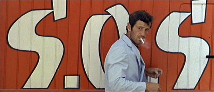 Esta dimensão pop também pode ser encontrada quando Ferdinand em fuga, desespera por encontrar Marianne. A fachada metálica pintada de vermelho com a inscrição branca do acrónimo S.O.S (01:13:18), com Ferdinand em primeiro plano (Fig. 5), reforçado com a narração em voz-off «(…) car les mots au milieu des ténèbres on l’étrange pouvoir d’éclairement» (Pierrot le Fou 1965, 01:13:14), é um apelo para colmatar a sua angústia, porque uma simples palavra pode transformar o mundo, tal como as leituras de Ferdinand o orientaram a traçar um caminho, e neste plano Ferdinand posiciona-se no lugar de um herói de banda desenhada.