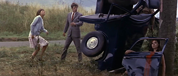 Renoir é uma vez mais explorado a partir da obra “Banhista deitada à beira-mar”14 (1897) (cerca de 00:25:22), como uma referência relativa à situação geográfica do sul de França para onde o casal se deslocava. Nesta viagem em direcção à Cote d’Azur, deparam-se com um acidente de viação (cerca de 00:26:10), tendo um veículo saído da estrada e embatido contra parte de um antigo viaduto abandonado. Existe uma absurda e visível encenação desta ocorrência (Fig. 6), um carro despistado e encostado verticalmente à estrutura de betão e a postura da senhora morta com um braço apoiado numa das portas do carro, são uma estranha “pintura”, um cenário que nos lembram as realidades fantásticas dos surrealistas que cultivavam o sonho e o inconsciente, mas também a Pintura Metafísica devido à ostentação de um ambiente misterioso, e enigmático. Para além disso, a atitude de Ferdinand e Marianne está próxima do nonsens dadaísta que antecedeu o surrealismo e que via na destruição e na desmoralização uma forma de criação.