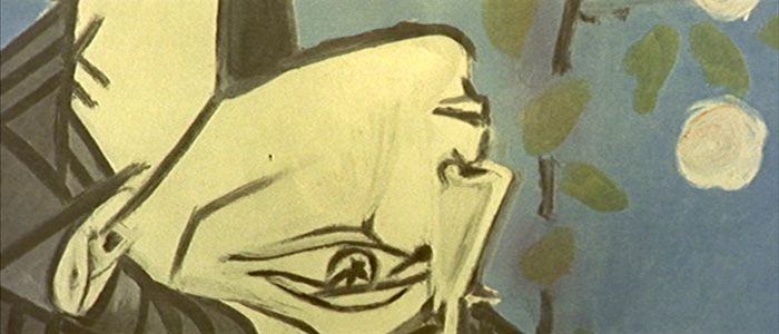 “Jacqueline com flores”16 (1954), de Pablo Picasso, Contracena numa parede com, “Retrato de Sylvette no sofá verde”17 (1954), igualmente de Picasso. “Jacqueline com flores” é uma obra cubista paradigmática do enlace amoroso que pode ser estabelecido entre homem e mulher, e é a imagem ideal de beleza mediterrânea. Nesta obra, Jacqueline Roque (1927-1986), então namorada18 de Picasso, é uma efígie do amor correspondido e nela podemos situar o romance de Ferdinand e Marianne. Na diegética do filme, enquadra-se no momento em que Marianne, aprisionada, espera pelo seu amor para a libertar (cerca de 01:05:07), contudo, em busca da sua amada, é detido pelos paramilitares da OAS – Organização Armada Secreta19 que o espancam. O critério visual domina frequentemente a totalidade do espaço do quadro, transformando-o numa pintura cinematográfica em movimento. Esta abordagem transcende a função meramente decorativa, conferindo profundidade e dinamismo à composição. Neste momento a cena narra os gritos de Ferdinand que acontece fora de enquadramento, como se de onomatopeias se tratassem, acompanhadas de um discurso imagético, primeiro com a cara de “Jacqueline com flores”, seguindo-se a mesma imagem mas 180º invertida (fig. 7), e finalmente a cara da pintura “Retrato de Sylvette no sofá verde” (cerca de 01:09:12). Esta sequência, mas sobretudo a imagem invertida, podemos dizer, revelam a tortura por que está a passar e representam a fragmentação do mundo, ademais, numa análise mais profunda, podemos supor que esta batalha acontece por causa de Marianne, e as pinturas têm o poder de ganhar vida, substituindo Ferdinand no filme e tornarem-se observadoras da difícil situação em que Pierrot se encontra. Por esta estratégia, as pinturas deixam de ser meros elementos decorativos e passam a exprimir aquele momento de terror, agitação, perturbação, mas também uma desordem, agora do lado do protagonista.