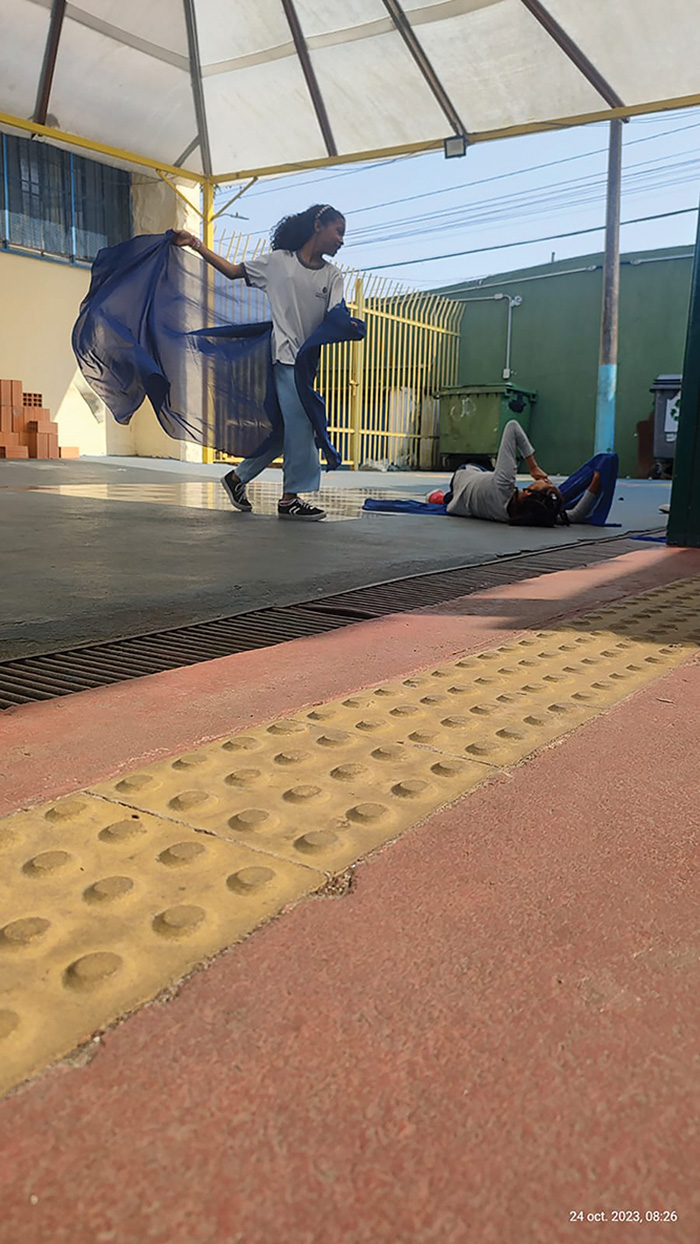 O combinado foi o seguinte: os estudantes formariam grupos e se dividiriam entre eles para que, enquanto alguns fizessem a performance com os tecidos, a pintura sobre o papel ou algo com a argila, os demais filmassem. Com algum tempo de interação, dava-se uma comanda para que trocassem os papéis, tornando as criações mais dinâmicas. Alguns, por estarem tão imersos no que faziam, permaneceram fazendo aquilo que lhes interessava naquele momento e, difícil era tirá-los de lá.