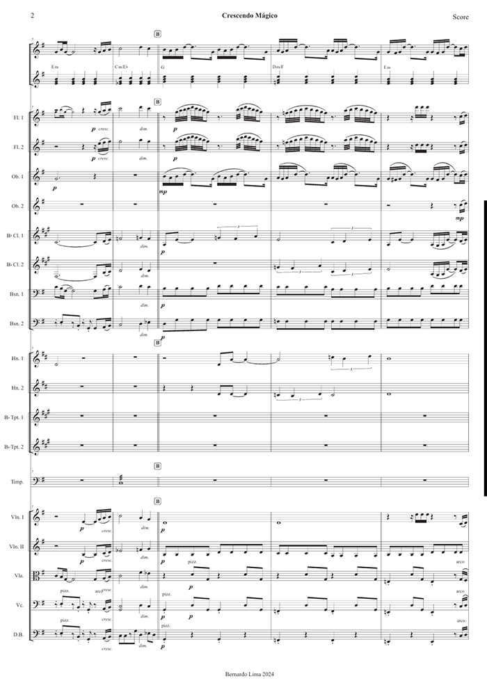 Como podem observar na Fig.3., neste documento escrito, denominado partitura, mostra-se como se deve tocar a peça musical. Esta composta por informações importantes para o entendimento da música, como o nome da partitura – Crescendo Mágico – o compasso, a tonalidade, o ritmo, as notas musicais, as dinâmicas, as indicações de tempo e as indicações orquestrais (orquestração), entre outras - na orquestração, cada instrumento musical segue uma linha já estabelecida na partitura geral e cada músico ou grupo de músicos tem a sua própria partitura específica. Este documento permite aos músicos tocar a música com exatidão e precisão, seguindo os tons, ritmos e dinâmicas originalmente planeados, sendo uma forma organizada de apresentar a música de maneira clara e concisa. Na parte de cima desta partitura, é apresentada a parte que o Enrique está a interpretar, utilizando o HeaDMI Netychords. A parte melódica da peça é reforçada pelos outros instrumentos que compõem a obra musical (para mais informações sobre o concerto, ver: https://www.ua.pt/pt/noticias/1/86741). Cabe salientar que o Enrique utiliza o olhar para tocar no HeaDMI Netychords. Quando está a utilizar o HeaDMI, tem que olhar de forma direta para o ecrã, e apenas pode olhar momentaneamente de forma periférica para o Diretor da Orquestra. També não pode olhar em simultâneo para uma partitura pelo que tem de a decorar para a poder executar com o HeaDMI Netychords instalado no seu computador.