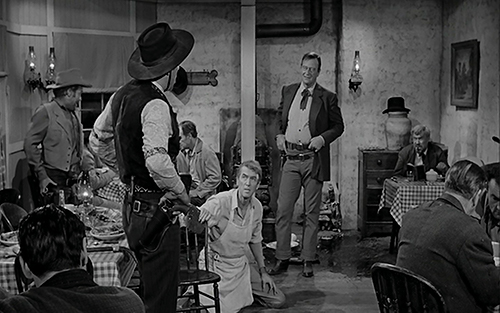 Jogo de montagem em Plano Médio de Tom e Liberty. Este atira algumas moedas para o chão virando-se para Tom: “Porque não compras outro bife Doniphon? Eu estou pagando”. E virando-se para a assistência: “O espetáculo terminou por agora”.