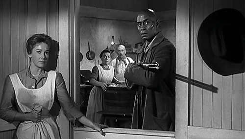 A câmara mostra-nos agora uma composição com Valance de costas em primeiro plano, Ranse a meio campo, quase impercetível e Doniphon ao fundo em Plano Médio, apontando para a direita: “O meu empregado Pompey na porta da cozinha”. O seu gesto e as suas palavras fazem Valance virar a cabeça naquela direção, servindo de motivação para o corte para Pompey, enquadrado pela porta da cozinha, segurando uma espingarda. Hallie está ao seu lado, mas fora do enquadramento da porta, num simbolismo visual que indica que ela não quer ter nada a ver com o que se está a passar6.