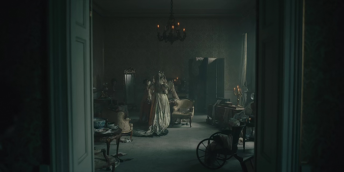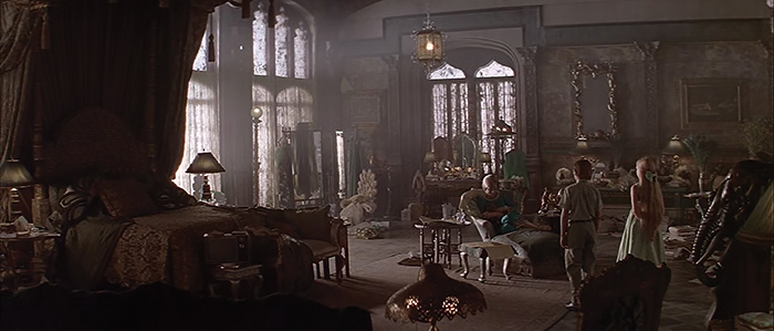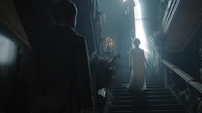The interior of the house, while neglected and dusty, is grand and luxurious in its architecture. Shown first through a wide crane shot, when Pip enters, we sweep with the camera and see a full view of the space which emphasizes how ample it is. Estella and Pip walk slowly up the stairs and through the corridor with Estella mentioning that ghosts are afraid to come to this house. This mention of ghosts is also unique to this adaptation and the music used adds to the feeling of horror, suggesting a dark layer underneath it all since even ghosts fear the skeletons in the closet. When we approach the door to Miss Havisham’s room, the camera floats eerily as if one of the aforementioned ghosts.