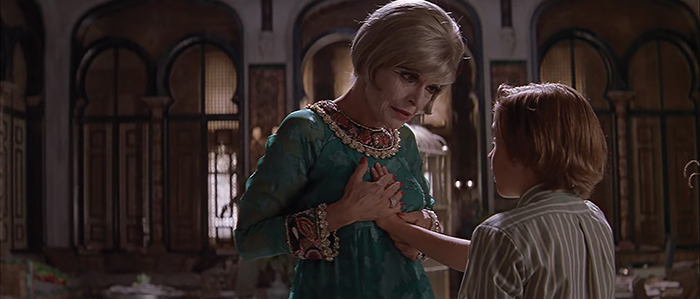 Miss Havisham remains seated, beckoning Pip closer. He doesn’t seem afraid, but trepidation is felt in his reluctance to get near her and the camera, moving in stages with him, emphasizes this. Miss Havisham’s one dramatic movement is when she gives a theatrical pronouncement of the iconic “broken heart” line, adding an eerie gravitas to the moment.