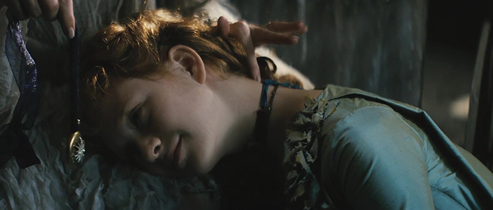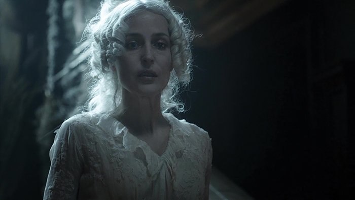 While her white dress may be a bridal outfit, it lacks traditional markers such as the veil or jewellery. More than appearing bridal, she seems ghostly as the emphasis is on her paleness and fragility (image 9). She is also barefoot, a fact Pip remarks on, asking if she’s cold, to which she replies, “all of me is cold” emphasizing her physical delicacy. Her lips and the back of her hand also speak of an illness and frailty.