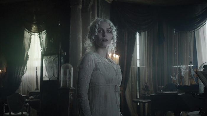 We meet Miss Havisham around minute 19, a third of the way into episode one. Right from the start of the scene, a notable change is the removal of Estella from the initial tour of the house. Rather than greeting Pip and setting the stage for Miss Havisham through her behavior, she is replaced by a maid who admits him. This shifts the focus entirely to Miss Havisham as she is the first to be introduced while also reserving Estella’s entrance for a more dramatic, romantic effect.