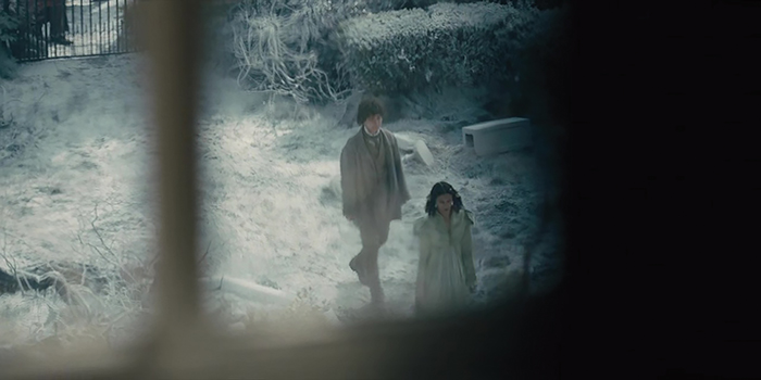 Another uncommon approach comes right after when we have a momentary break from Pip’s first-person narrator role as the camera offers Miss Havisham’s perspective observing the two of them through the window (image 12). This shows Miss Havisham as an all-knowing character but also adds to the tension since it hints at control and surveillance.