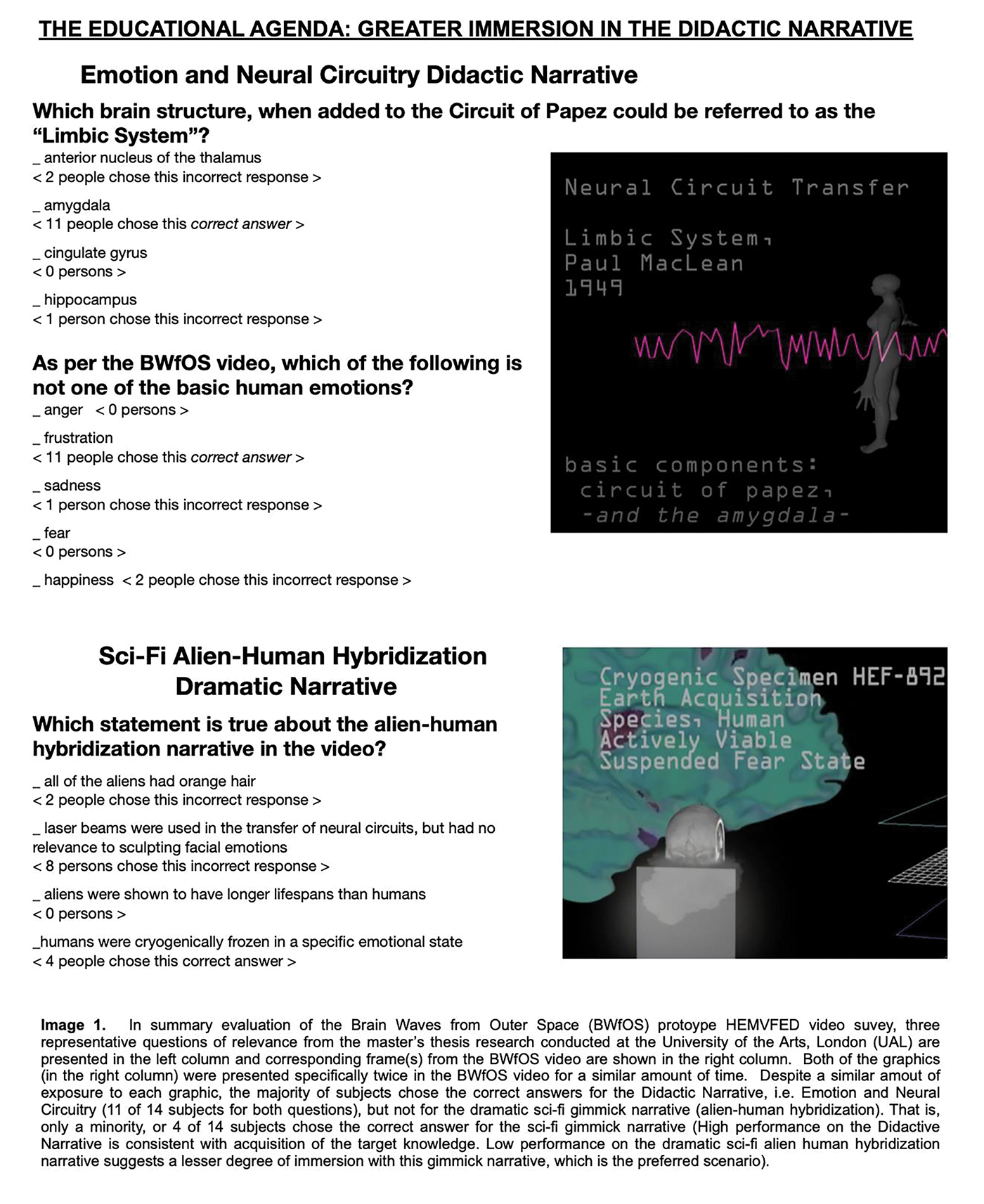 Conversely, as suggestive evidence that the dramatic narrative was not fully immersive, the question evaluating comprehension of the dramatic narrative (question 1.3) was answered correctly by only 4 of 14 participants. And, in terms of a rudimentary control of the relevant temporal exposure variables, the visual effects and exposition from both the dramatic sci-fi narrative and didactic narratives were presented for a similar amount of time within the full BWfOS video [two clips for test question relevant didactics, 1:51-1:59 and 7:31-7:33, and two clips for the test question relevant sci-fi drama, 2:38-2:42 and 5:44-5:50 (Ottowitz 2021, 2020)]. Thus, the learning outcome wasn’t simply a reflection of the number of clip exposures or total time of exposure (i.e. in regard to these specific test questions, both the dramatic narrative and didactic narrative involve 2 clips and both are presented for a total of 10 seconds). As detailed previously, the dramatic sci-fi narrative (alien-human hybridization) was merely a surface ‘gimmick narrative’ presented in an intentionally deconstructed and nonlinear form aiming to merely engage subjects in a passive secondary manner, i.e. in an incomplete or superficial manner relative to the didactic narrative (emotion and neural circuitry), which was intentionally presented in a more intelligible manner. An excerpt of this survey, with explicit presentation of three relevant questions (1.3, 1.4, 2.2) is presented in Image 1, and the full survey is available in the appendix of my UAL master’s thesis (Ottowitz 2021).