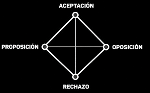 El remake de 2010 hace hincapié en un hecho moral de la transformación, al plantear que es más fácil matar a la bestia, al hombre lobo, que al hombre, hecho que se refleja en la siguiente frase pronunciada en el film y que expresa el quiasmo que se pone en juego: “Dicen que matar a una bestia no es pecado, sólo si se hace a un hombre, pero donde está el límite entre la bestia y el hombre”. También existe diferencia en estas dos películas en lo que Aristóteles definía como la anagnórisis, ese momento del reconocimiento. Este gesto se da en el cine cuando reconocemos que el monstruo ha muerto, pero aparece el ser humano que ocultaba, consecuencia de que las heridas provocadas al hombre lobo se reconozcan en el hombre. En la película de 1941, la anagnórisis se da por el espectador cuando el cíngaro es reconocido como el lobo muerto por el protagonista ante su ataque. Sin embargo, el remake de 2010 da agnición desde el punto de vista de la protagonista, cuando esta reconoce en el hombre lobo muerto a su amado. La metamorfosis de hombre en hombre lobo refleja la teoría de diamantes que incorpora la estética modal para explicar el arte como modo de relación. Diamantizar, desde los planteamientos de Rudolph Kaehr, “supone abstraer y subvertir el nivel semántico de tematización para así poner en primer plano los patrones, los morfogramas de interacción o reflexión de la comunicación” (Claramonte 2016, p. 160). De este modo para construir un diamante, en una suerte de geometría oposicional, colocaríamos una proposición en uno de sus vértices y en el opuesto la proposición contraria, en los vértices que quedan colocaríamos la posibilidad de que la dos se den a la vez y la de que no se den ninguna de las dos.