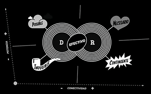 Si hablamos de la categoría de lo disposicional nos encontraremos con los modos de lo posible y su negativo lo imposible que remite a cómo emerge una práctica y a lo que se hace practicable y lo que no. Para definir lo posible podríamos preguntarnos por qué es lo imposible, desembocando en una doble negación, que, en términos estéticos, sería lo que no invalida la cristalización artística, lo que, en definitiva, la hace practicable. Es interesante destacar de cara a la estética que, en ocasiones, también se confunde lo posible con lo efectivo, de tal forma que nos sentimos maravillados con lo que la técnica podría hacer practicable, como si por ser posible tuviera que ser efectivo, pero no prestamos atención a lo que verdaderamente se da en el paisaje-complexo. Como escribe Brecht en un texto sobre la aparición de la radio, nos dejamos entusiasmar por la posibilidad de que esté “al alcance del mundo entero un vals vienés…”, “…nos dejamos dar en las narices por las posibilidades” (Brecht, 1973, p. 5).
