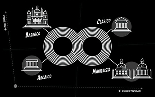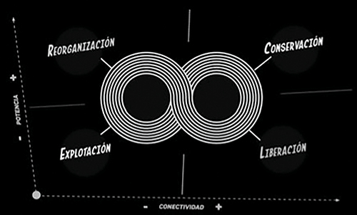 Si seguimos el esquema modal con un ejemplo que propone Claramonte, podemos ver que los procesos en los cambios artísticos se pueden explicar recuperando la noción de panarquía, dándose cambios desde la destrucción a la reorganización en relación con los diferentes modos de la necesidad, la contingencia, la posibilidad y la imposibilidad. Se identifican “cuatro funciones, las cuatro clases de inteligencias, características de todo ciclo adaptativo podrían ser denominadas con los términos: conservación, liberación, reorganización y explotación” (Claramonte 2016, p. 142).