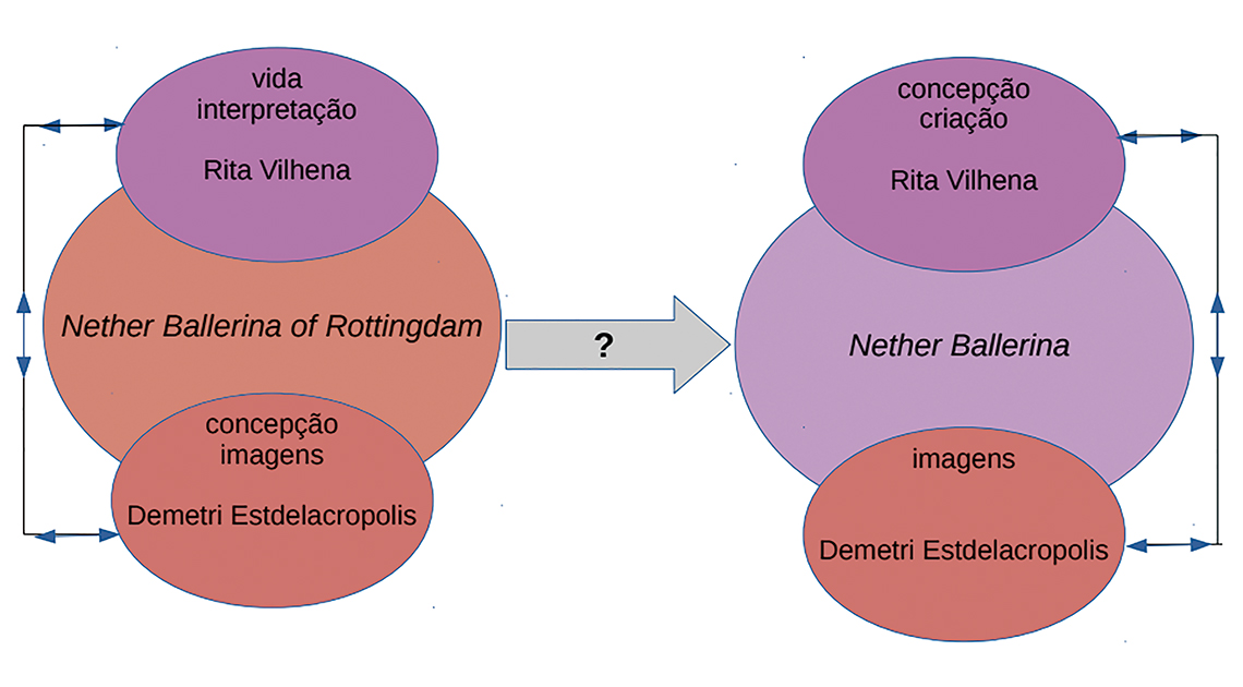 O gráfico seguinte esquematiza o movimento de trocas e tensões geradas no processo criativo entre o realizador Estdelacropolis e a bailarina Vilhena. Coloca também em destaque o lugar de emancipação, a bailarina que se transforma e assume o papel de realizadora, considerando que aqui o termo emancipação se refere ao corpo que produz vida e reformula o que quer representar.