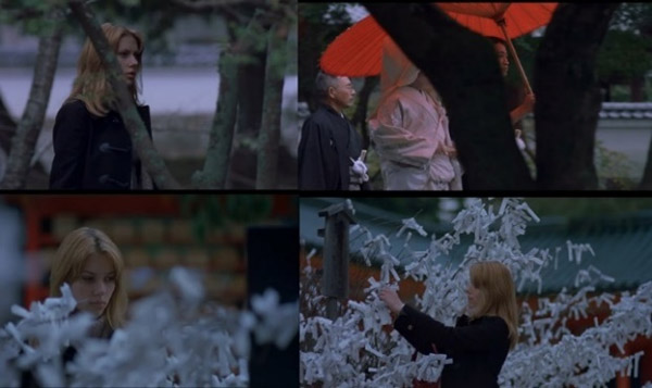 Num outro momento, em um passeio pela cidade, Charlotte tem seu olhar atraído por um casal de noivos, que vestidos tradicionalmente com trajes típicos de uma cerimônia, transitam pelo templo. Ela se demora novamente, observando (com estranhamento) esta cena, e vai se aproximando como se estivesse em transe. Novamente, seu corpo é atravessado por galhos de árvores (pelo nosso olhar), assim como sua visão (uma imagem se funde na outra, vê-se partes dela, e partes não [vemos pelos olhos de Charlotte]). Podemos entender que parte do que é da ordem da consciência (daquilo que vemos e sabemos que está ali, logicamente) e da inconsciência (do que não podemos ver, mas “sentimos” que está ali [estranhamento/infamiliar]) estão (sempre) juntos, e são sentidos ao mesmo tempo. Ela encontra neste templo a árvore dos desejos, escreve um desejo num pedaço de papel, e o amarra no galho da árvore. Seu desejo permanece oculto. A imagem mostra Charlotte absorta em desejos (seus, dos outros...). Seu desejo inconsciente se relaciona com o “desejo desejado” (escrito no pedaço de papel, “nomeado”), mas sua definição, permanece inconsciente. Velado.