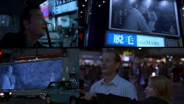Pode-se a isso, associar as cenas em que Bob, protagonista de Lost in Translation, se vê nos outdoors da cidade. A imagem artificial de si estampada como propaganda (de si/de outro), compondo as imagens da cidade (o estático que se opõe ou que está oposto ao movimento), parece também, causar estranhamento/desterritorialização/desacomodo na personagem.