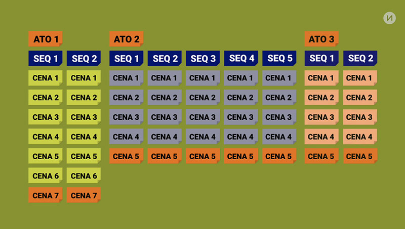 Figura 1 – Modelo de estrutura de escaleta identificado por sequence approach utilizado por Anna Muylaert para a distribuição das cenas e das sequências ao longo dos atos de um projeto de longa-metragem com duração de aproximadamente 90 minutos.