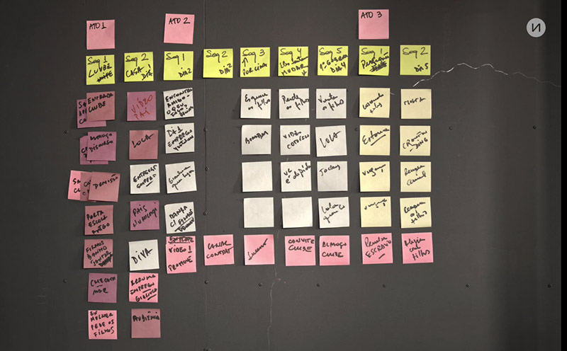 Nessa estruturação, Muylaert comenta que o difícil, como em toda escrita, é pensar; e cita para explicitar isso uma fala atribuída a Woody Allen que costuma usar: “Escrever é fácil, difícil é pensar”. A cineasta conta que, por isso, tem gestações bem longas diante dos post-its na parede (ver figura 2), antes de sentar para escrever.