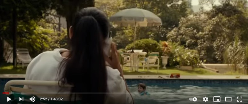 Figura 7 – Print do filme Que horas ela volta?. Cena do prólogo de abertura do filme, em que Val observa Fabinho na piscina, ainda criança, enquanto tenta falar com a filha ao telefone. Fonte: Filme Que horas ela volta, 2015.