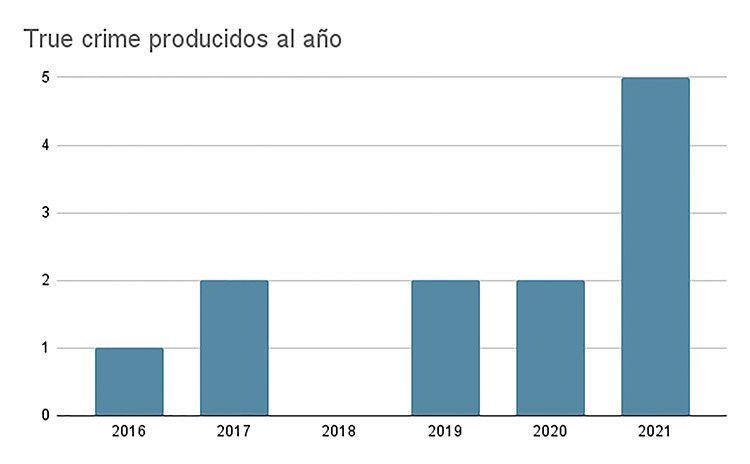 True crime is a genre in itself that tries to examine or portray real crimes. In Spain, video-on-demand platforms such as Netflix, HBO and Movistar are increasingly investing in this type of content. From 2016 to 2021, during 5 years, 12 true crime documentaries have been produced in our country. This study aims to establish the evolution and characteristics of this type of audiovisual content produced in Spain and available on streaming services. For this research, a special analysis table has been drawn up, with 8 sections common to all the documentaries in the study sample. In this way, it has been possible to establish common features, as well as the development of this genre in Spain in recent years. It is concluded that Spanish true crime productions on digital platforms are booming and most of them have a more intimate and creative tendency, leaving aside morbidity and sensationalism.
