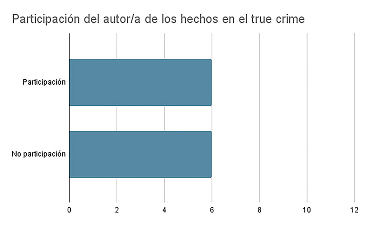 Es interesante poner el foco en ciertos datos extraídos del análisis. En la Figura 4 vemos que en la mitad de los true crime españoles estudiados hay participación del autor o autora de los hechos, ya sea a través de llamadas telefónicas o carta porque está en la cárcel, o una entrevista canónica hablando a cámara. Asimismo, en la Figura 5 se observa que no existe una tendencia clara tendencia clara de si el true crime español apuesta más por contar los hechos desde el prisma de la víctima o del/la criminal. En contraposición (Figura 6), hay más directores que directoras haciendo este tipo de contenido para las plataformas digitales. Bien es cierto, que los tres true crime dirigidos por mujeres son aquellos donde la víctima es una mujer.