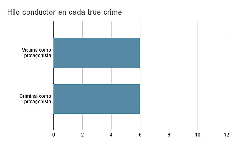 Tras el análisis de las 12 series se han identificado que las características generales de este contenido son diversas. Pero primero habría que mencionar los principales temas que se tratan en los true crime españoles. La tendencia marca que la mayoría se centran en crímenes de sangre, los cuales son: Muerte en León. 2016. De Justin Webster; Lo que la verdad esconde: el caso Asunta. 2017. De Elías León Siminiani; Yo fui un asesino. 2017. De Juan Moya; El caso Alcàsser. 2019. De Elías León Siminiani; El estado contra Pablo Ibar. 2020. De Olmo Figueredo González Quevedo; El caso Wanninkhof-Carabantes. 2021. De Tània Balló; ¿Dónde está Marta? 2021. De Paula Cons y Lucía en la telaraña. 2021. De Tomás Ocaña Urwitz, Rafael González Pérez, Sofía Ocaña. Luego hay dos casos dedicados a las sectas: El Palmar de Troya. 2020. De Israel del Santo y Edelweiss. 2021. De Eulogio Romero. Y dos a los delitos de abusos sexuales: Examen de conciencia. 2019. De Albert Solé y Nevenka. 2021. De Maribel Sánchez-Maroto. No obstante, aunque traten temas diferentes tienen características comunes: