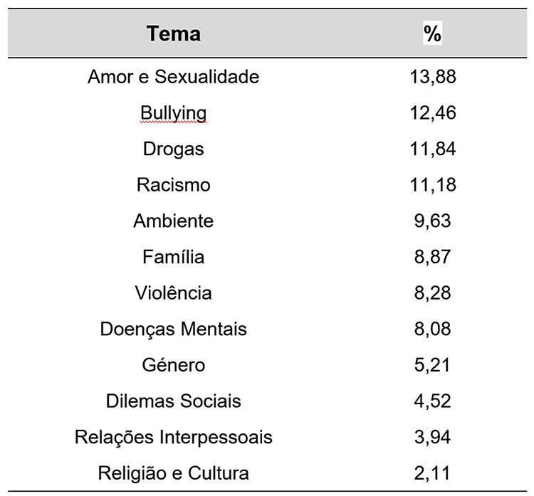A Tabela 1 evidencia as preocupações centrais dos alunos das ilhas dos Açores, com ênfase em questões de “Amor e Sexualidade”, “Bullying” e “Drogas”, que perfazem 13,88%, 12,46% e 11,84% das respostas, respetivamente. Esta distribuição sinaliza a relevância de temas ligados a relações interpessoais, conflitos sociais e problemas de dependências no contexto estudantil açoriano.